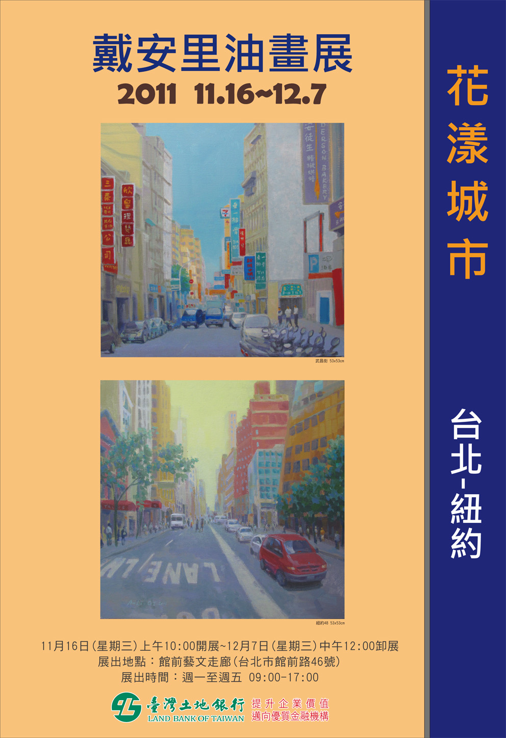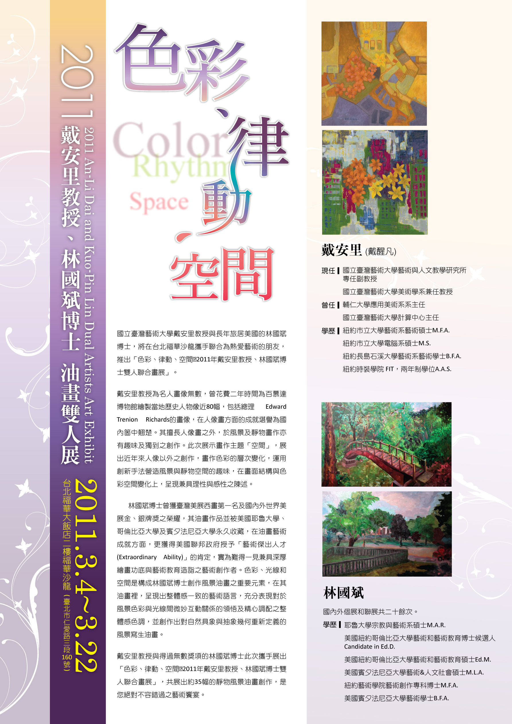 Professor An-li Dai and Dr. Kuo-pin Lin, who has won numerous awards for his talents in painting, will hold the “Color, Rhythm, Space – 2011 An-li Dai & Kuo-pin Lin Oil Paintings Exhibition” together and present over 35 pieces of landscape paintings and still-life artworks to the public. Please do not miss this opportunity to see this feast of artworks.