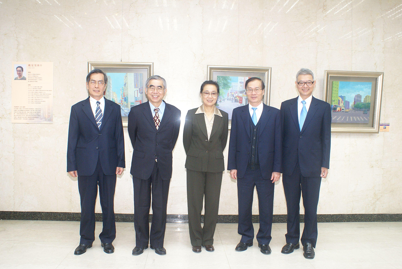 Yao-xing Wang (chairman of Land Bank), Le-ming Su (general manager of Land Bank), Tian-shang Fan (chief secretary of Land Bank), Ming-zhe Chen (secretariat director of Land Bank) and An-li Dai were all present for a photo at the opening of the exhibition.